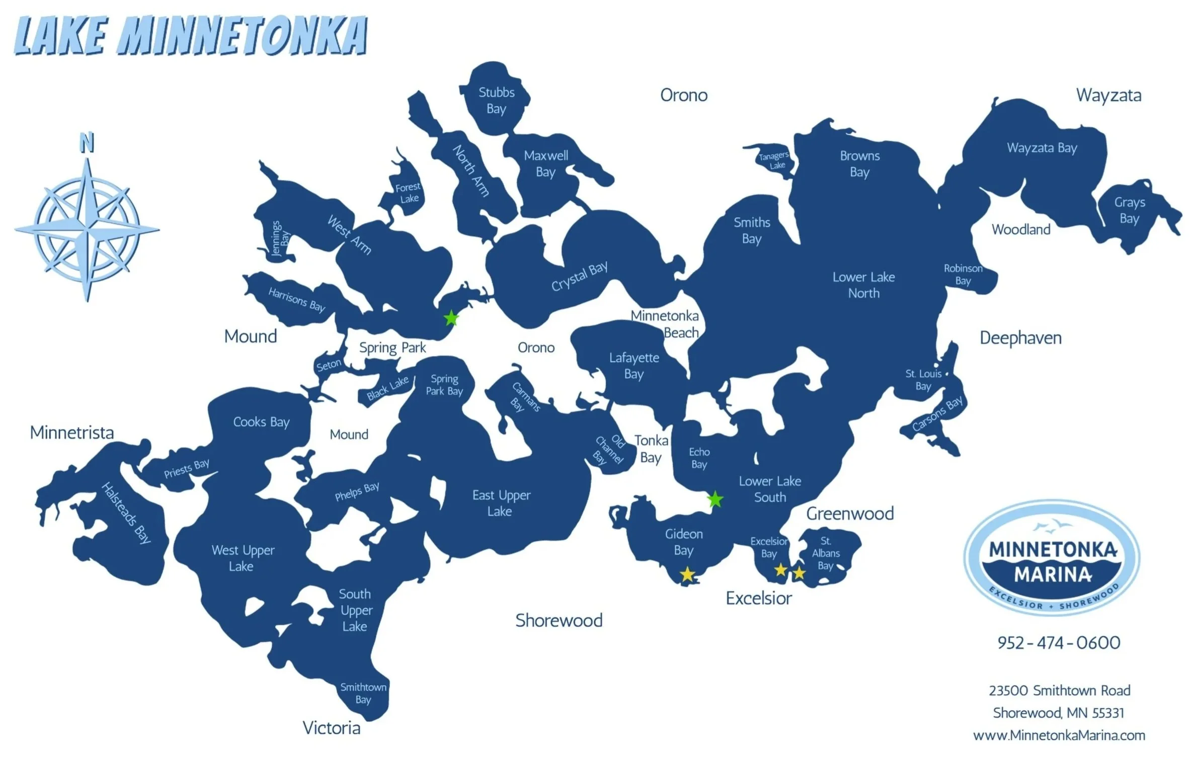 Minnetonka Marina Slip Members receive a gas discount of $.50 per gallon of gas all season at The Caribbean Marina and Sunset Boat Yards (formerly know as Rockvam). The gas docks are marked with green stars and our marina locations are marked with yellow stars on the map below.